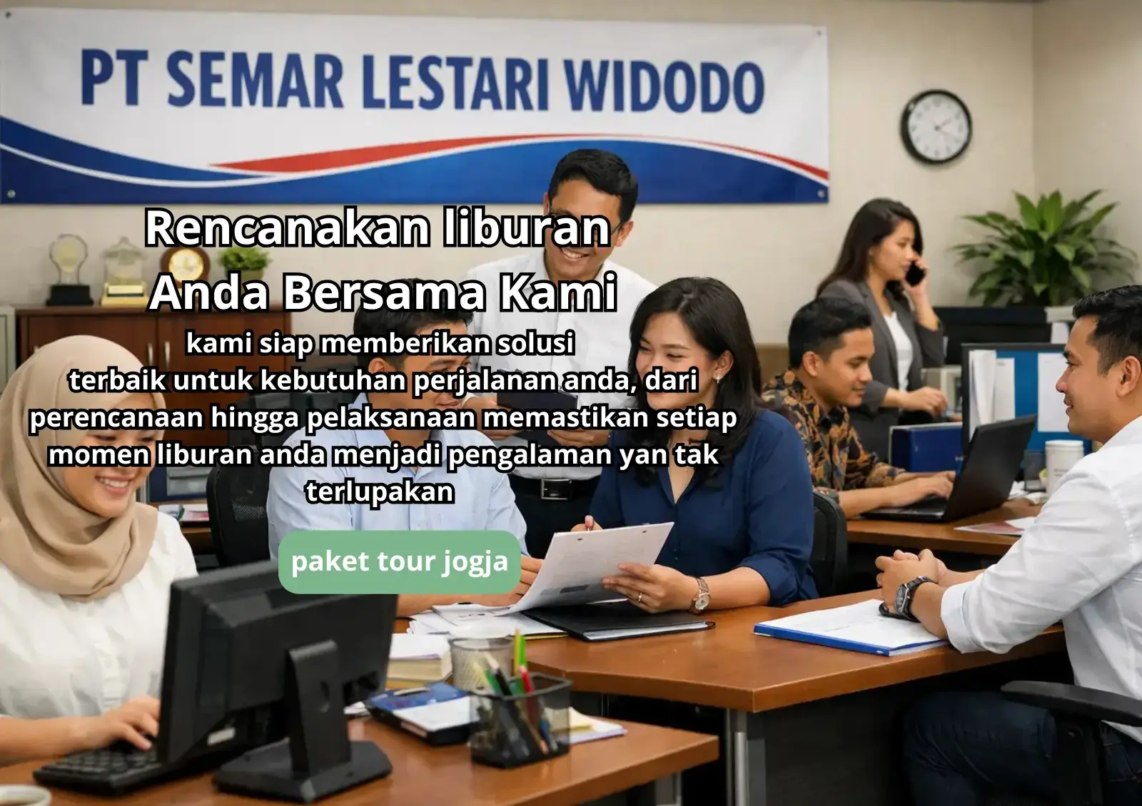 PT Semar Lestari Widodo berkomitmen untuk memberikan pengalaman wisata yang unik dan berarti. Dengan tim profesional yang berpengalaman, kami menawarkan berbagai paket wisata yang fleksibel dan disesuaikan dengan kebutuhan Anda. Dari keindahan alam, kekayaan budaya, hingga sejarah yang menarik, kami siap mengalihkan perhatian Anda ke destinasi terbaik di Indonesia.